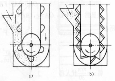 淺料鬥:輸送潮濕、易結塊、難拋出的物料。如濕沙、濕煤等。