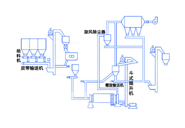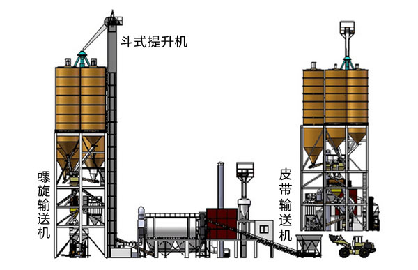 【生產流程描述】1、骨料烘幹:A、三回程烘幹機,小時產量100噸。2、變頻調速皮帶輸送機機供料,依據骨料潮濕程度調整供料速度,確保出料含水率和烘幹產量的匹配。3、袋式除塵器、高通風,提高除塵效果,保護環境。布袋除塵兩級分離除塵,排除的廢氣經過脫硫塔脫硫。4、粉體料分別螺旋輸送機喂料到秤鬥計量。5、根據當地條件選用熱源。有兩種選擇,一是配件沸騰爐,用以燃燒生物燃料或煤炭;二是配做燃燒室,用以燃燒天然氣或油。6、烘(hong)幹(gan)的(de)骨(gu)料(liao)經(jing)過(guo)篩(shai)分(fen)去(qu)粗(cu)後(hou)進(jin)入(ru)鬥(dou)式(shi)提(ti)升(sheng)機(ji)。篩(shai)分(fen)機(ji)可(ke)選(xuan)用(yong)振(zhen)動(dong)篩(shai)或(huo)圓(yuan)筒(tong)篩(shai)。經(jing)過(guo)攪(jiao)拌(ban)混(hun)合(he)圴(圴)勻(yun)的(de)物(wu)料(liao)從(cong)攪(jiao)拌(ban)機(ji)卸(xie)入(ru)成(cheng)品(pin)鬥(dou),通(tong)過(guo)氣(qi)動(dong)三(san)通(tong)分(fen)為(wei)兩(liang)路(lu):一路直接經過散裝機進入散裝車運往工地。另一路經過螺旋輸送到包裝過度倉包裝。