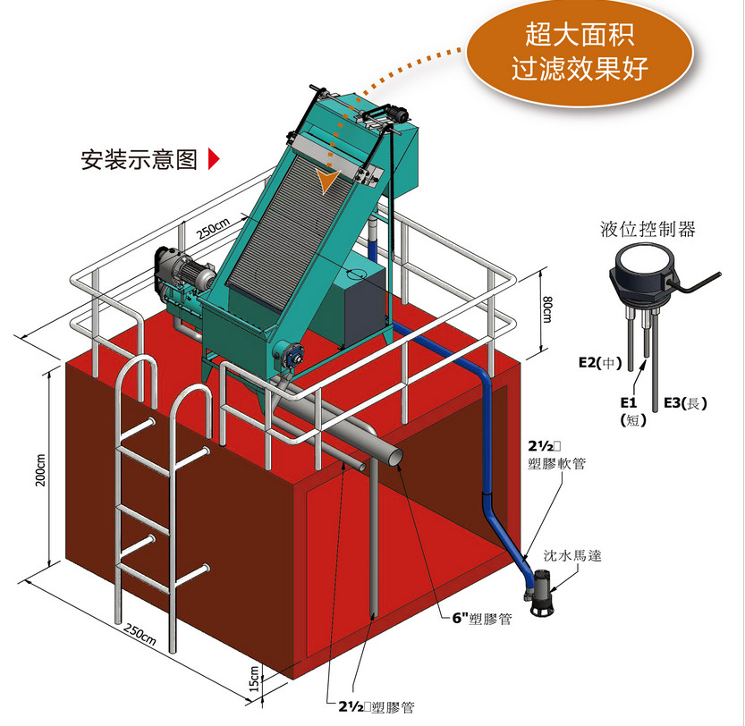 斜xie篩shai式shi幹gan濕shi分fen離li器qi主zhu體ti為wei由you楔xie形xing鋼gang棒bang經jing製zhi成cheng的de不bu鏽xiu鋼gang平ping麵mian過guo濾lv篩shai麵mian,待dai處chu理li廢fei水shui通tong過guo溢yi流liu堰yan均jun勻yun分fen布bu到dao傾qing斜xie篩shai麵mian上shang,由you於yu篩shai網wang表biao麵mian間jian隙xi小xiao、平(ping)滑(hua),背(bei)麵(mian)間(jian)隙(xi)大(da),排(pai)水(shui)順(shun)暢(chang),不(bu)易(yi)阻(zu)塞(sai),固(gu)態(tai)物(wu)質(zhi)被(bei)截(jie)留(liu),過(guo)濾(lv)後(hou)的(de)水(shui)從(cong)篩(shai)板(ban)縫(feng)隙(xi)中(zhong)流(liu)出(chu),同(tong)時(shi)在(zai)水(shui)力(li)作(zuo)用(yong)下(xia),固(gu)態(tai)物(wu)質(zhi)被(bei)推(tui)到(dao)篩(shai)板(ban)下(xia)端(duan)排(pai)出(chu),從(cong)而(er)達(da)到(dao)固(gu)液(ye)分(fen)離(li)目(mu)的(de)。