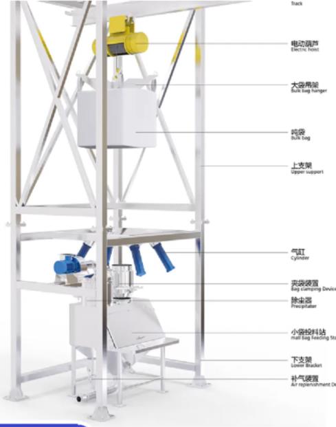 噸包無塵投料站可處理狀、顆粒狀、小塊狀的噸袋拆包卸料輸送作業,另外在石油化工、原料藥、塑料、碳黑、礦業、食品添加劑,水泥等行業中廣泛使用,結構簡單,生產成本低,操作簡單方便,性價比高,自帶收塵,讓塵不再飛揚。
