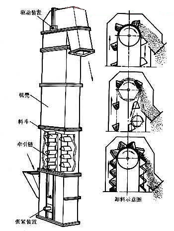 挖鬥提升機是使用鏈條、皮帶、鐵鏈等帶動料鬥來達到提升輸送物料的效果,主要適用於粉狀、顆粒狀及小塊物料的連續垂直提升,可廣泛應用於各種規模的飼料廠、麵粉廠、米廠、油廠、澱粉廠以及糧庫、港口碼頭等的散裝物料的提升。